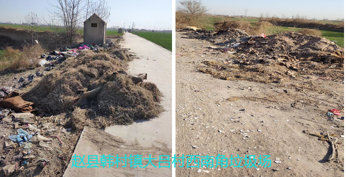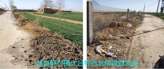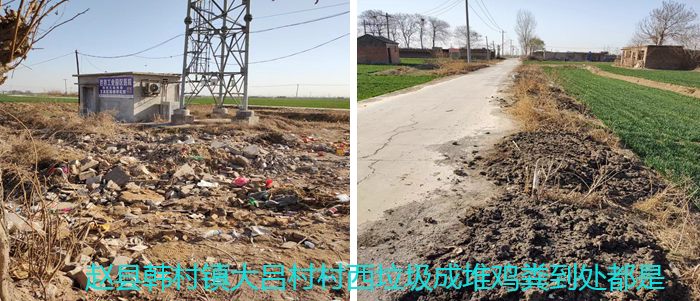 大吕村也是韩村镇的管辖之地这个村也是个大村,在这个村的村西护忖公路上从南道北到处是垃圾,建筑垃圾和生活垃圾混合在一起犹如小山,到了公路的北边两边全是鸡粪不但影响美观还臭气难闻,这样的情景紧挨村边就不应该出现,来到了这个村的最北边的东西街,